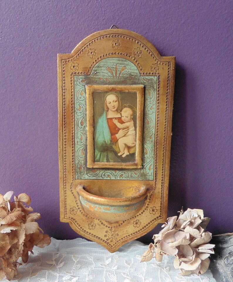 Antique Virgin Child Madonna Del Granduca Raphael Golden Wood Holy Water Font Stoup Renaissance Florentine Altar Religious Catholic